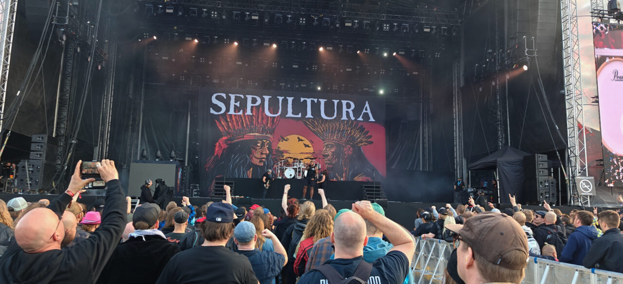 Porukkaa oli kertynyt kiitettävästi alueelle metallilegenda Sepulturan aloittaessa raivoisan riffimyrskynsä. Sepultura-paitoja näkyi monen yllä ja vaikka bändissä ei ole nykyään ainuttakaan alkuperäisjäsentä, Sepulturan odotuksen saattoi aistia ilmassa ja festarikansan olemuksessa. Bändiä johtaa nykyään lähes alusta lähtien mukana ollut kitaristi Andreas Kisser ja onhan mies soittanut kaikilla Sepultura-klassikoilla, joten siinä mielessä Kisserillä on ”valtuutus” kiertää Sepulturan juhlakiertueen merkeissä. Vanhoja hyviä aikoja muistellen, samalla keikkaa markkinoitiin bändin viimeisenä Suomen keikkana. Show saatiin alkuun heti kunnon mellakalla Beneath the remains ja Inner self -klassikoiden myötä. Kansa kävi kuumana, mutta vokalisti Derrick Greenin vokaalit olivat varjojen mailla. Allekirjoittanut ei ole koskaan tottunut Greenin vokaaleihin vanhemman Sepultura-materiaalin kohdalla, tuoreempi toimii paremmin. Riffimylly oli aivan mieletön mutta ne Greenin vokaalit. Onneksi asiaan saatiin parannusta. Arise-albumin Desperate cry jatkoi armotonta riffimyllyä ja pitti sai lisävirtaa. Tuoreemmassa Phantom self -kappaleessa Greenin ääni oli äkkiä pelkkää murhaa ja raakaa energiaa, kuten Means to an end -aggressiossa.