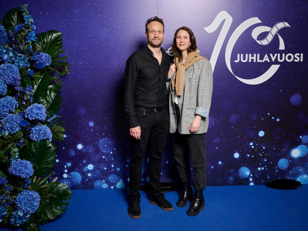 Elias Vesterberg saapui juhliin näyttelijäpuolisonsa Oksana Lommin kanssa.