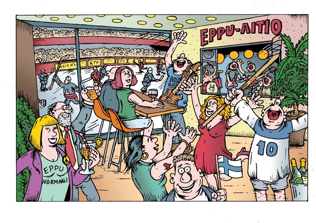 Katso alta legendaarinen musiikkitoimittaja ja sarjakuvataiteilija Juho Juntusen Eppu-aitiosta tekemä pilapiirros.