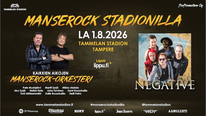 Manserock stadionilla -konsertti: lavalla Martti Syrjä, Pate Mustajärvi, Mikko Alatalo ja Heikki Hela sekä paluun tekevä Negative