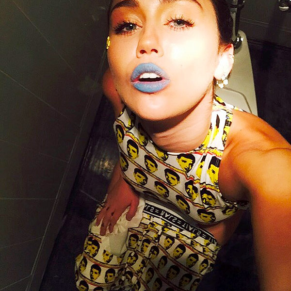 Lauantai-aamuna otettu foto näyttää Mileyn istumassa pytyllä yllään Andy Warhol -tyylinen Drake-asuste. Huomaa myös Mileyn asiaan kuuluva sininen huuliväri.