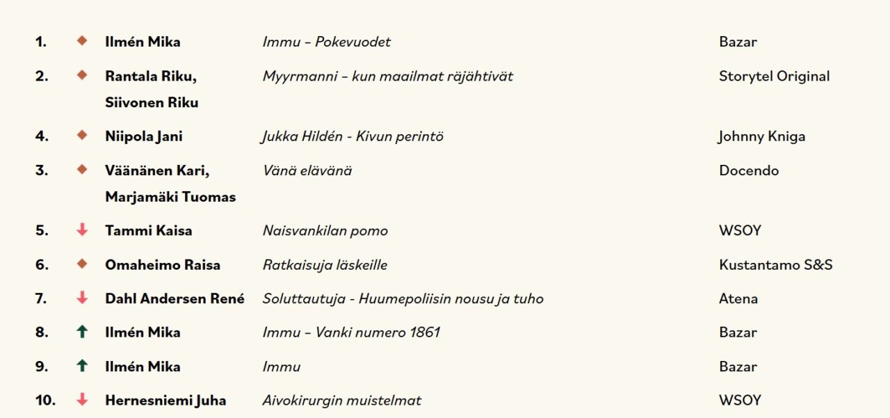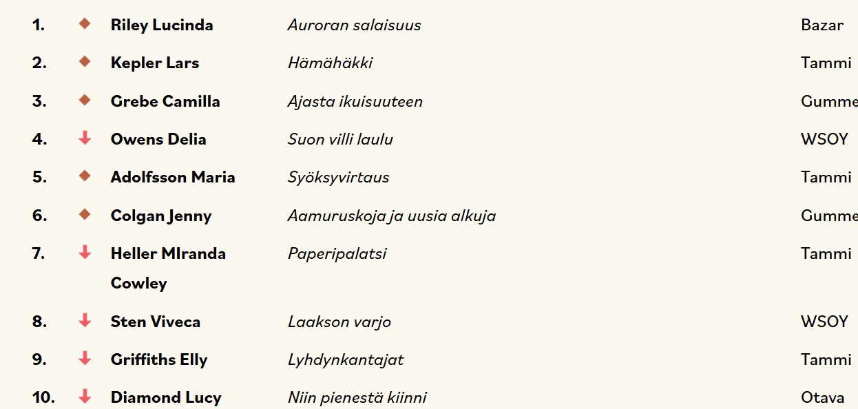 Kuukauden kakkoseksi kipusi lokakuun puolivälissä ilmestynyt Christian Rönnbackan uutuusdekkari Kostajan merkki (Bazar, 2022). Kolmossijalle nousi Lucinda Rileyn teos Auroran salaisuus (Bazar, 2022).