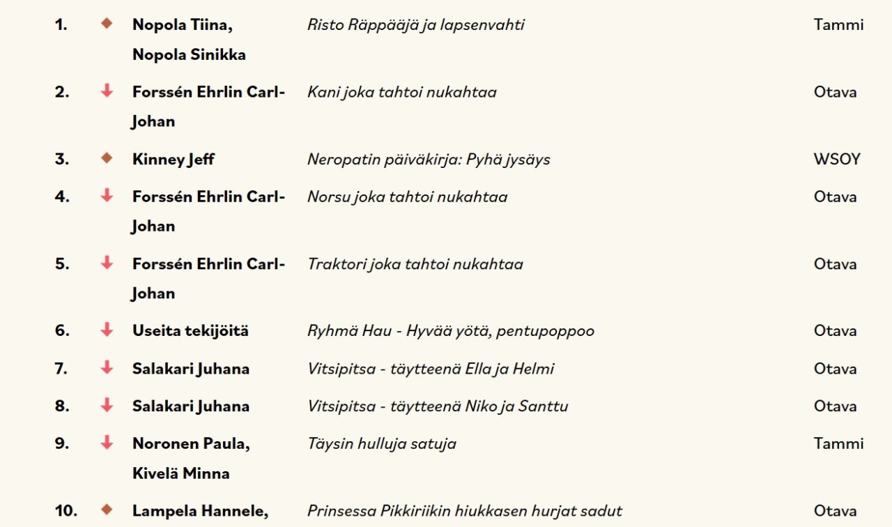 Kirjakauppaliitto on julkaissut lokakuun myydyimmät teokset Mitä Suomi lukee -listalla. Kuukauden myydyimmäksi teokseksi nousi Sinikka Nopolan ja Tiina Nopolan Risto Räppääjä ja lastenvahti (Tammi, 2022), joka myi erityisesti äänikirjana.