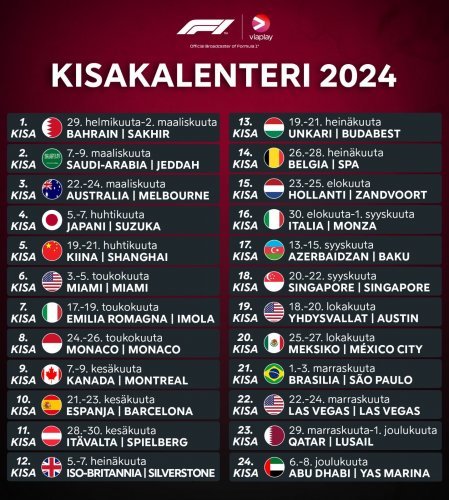 Viaplayn formulakausi pitää sisällään126 suoraa lähetystä helmikuusta joulukuuhun. Kiinan Grand Prix’n palatessa kisakalenteriin ajetaan alkavalla kaudella ennätykselliset 24 osakilpailua.